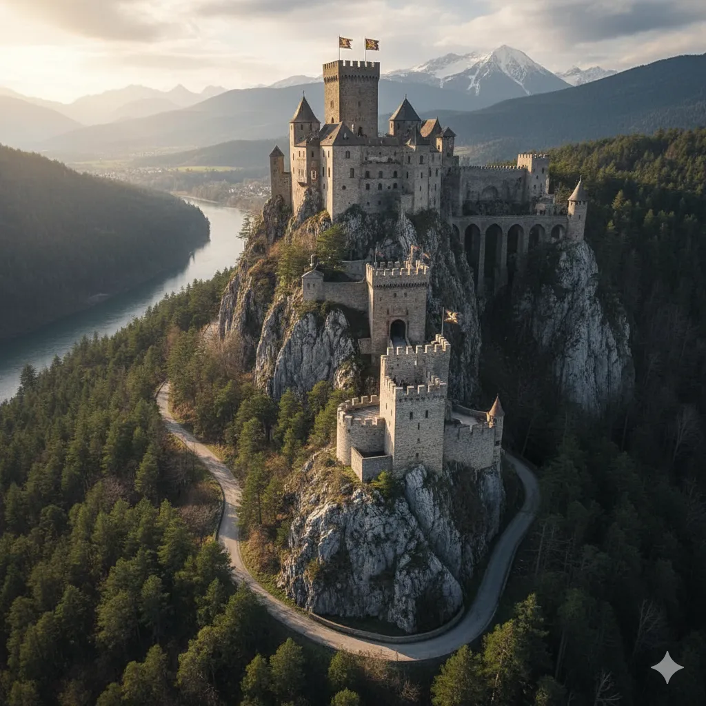 Arkitektonisk illustration af et middelalderligt slot. Historisk nøjagtigt med kreative tilføjelser.